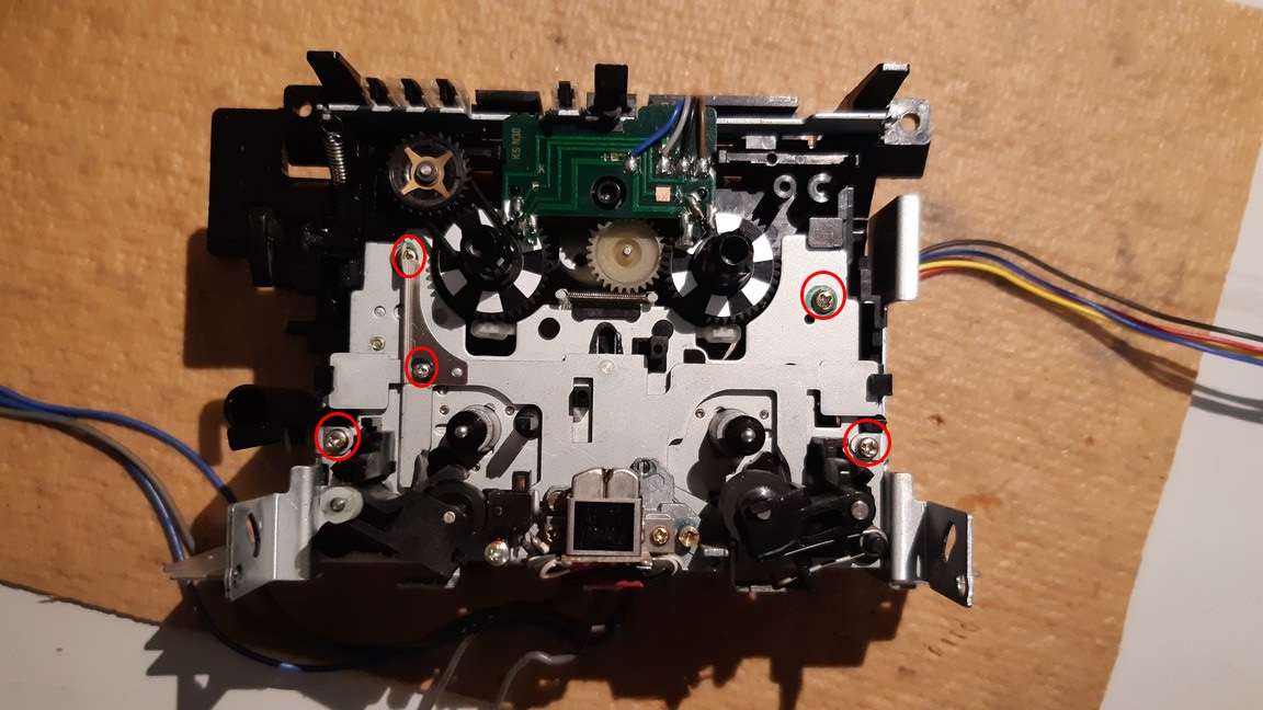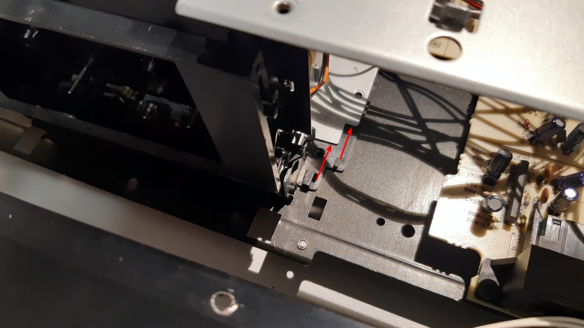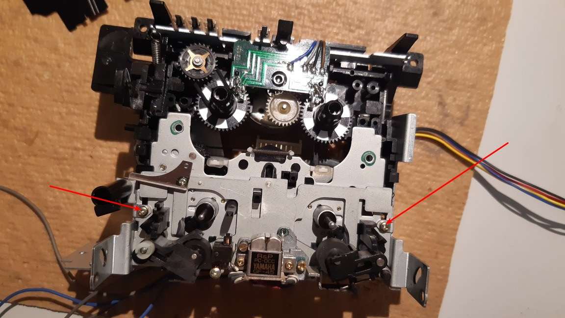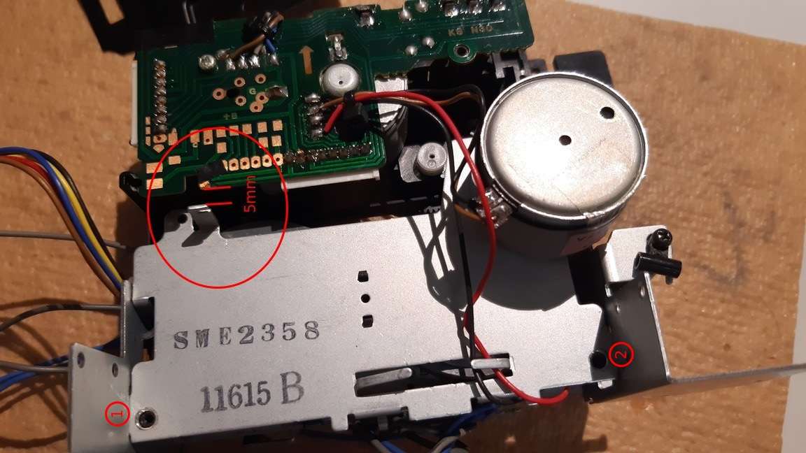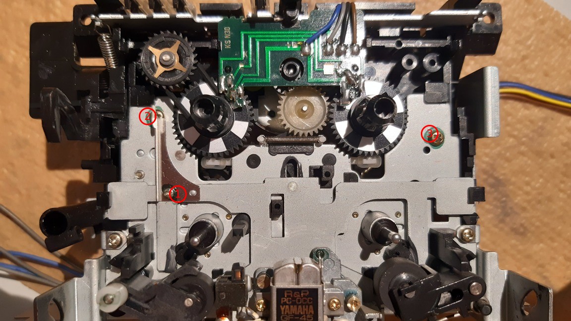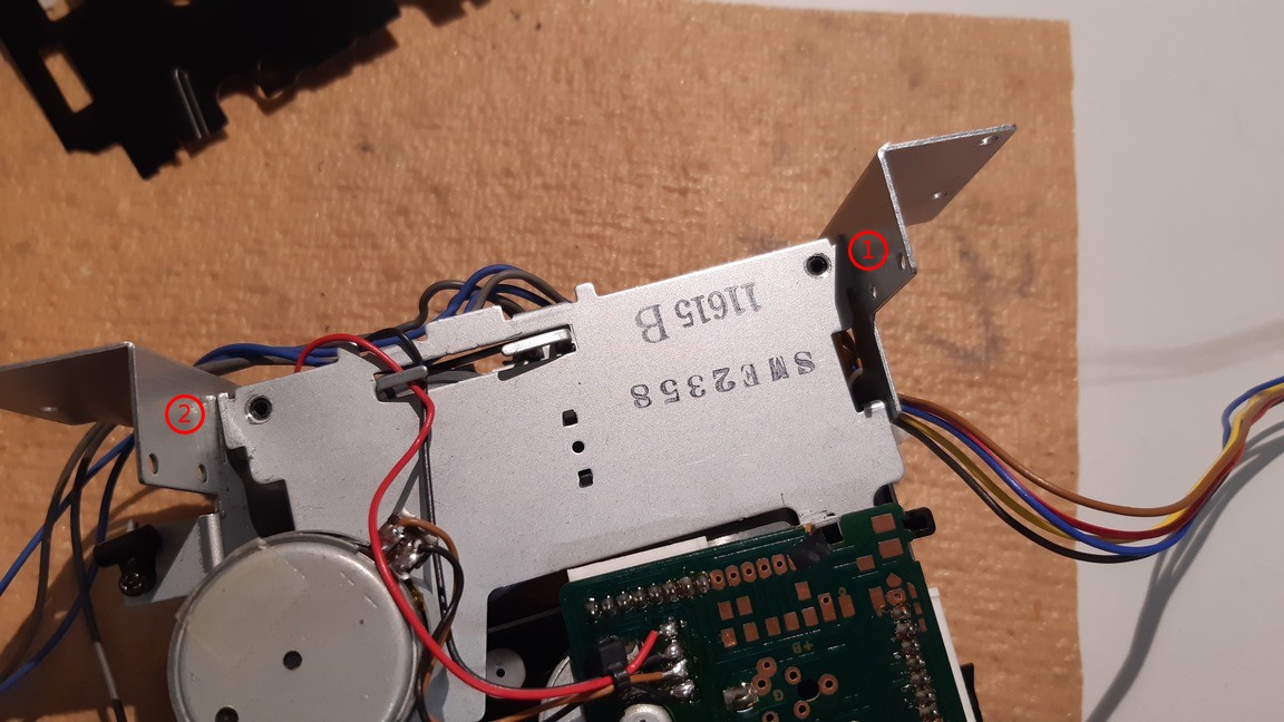 As a next step the metal plates on the side (1) and (2) have be removed. This is necessary to finally lift the capstan plate.
