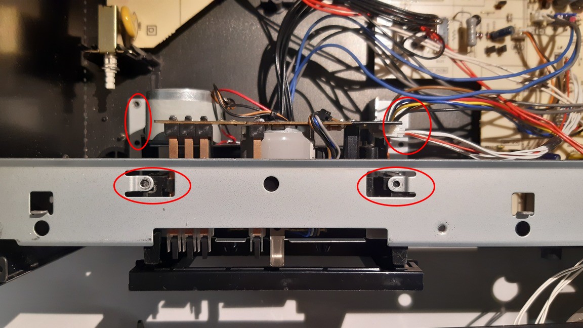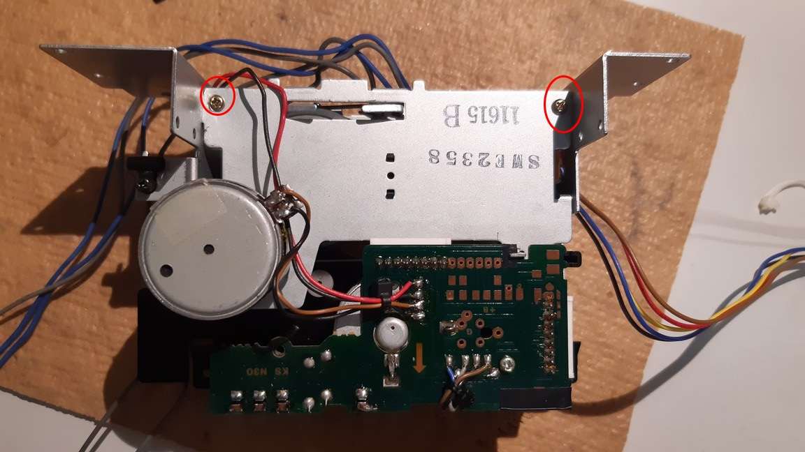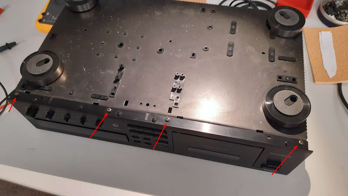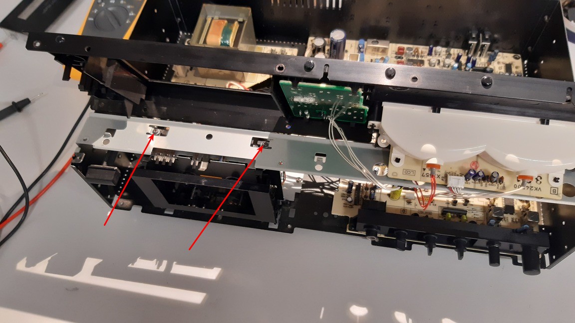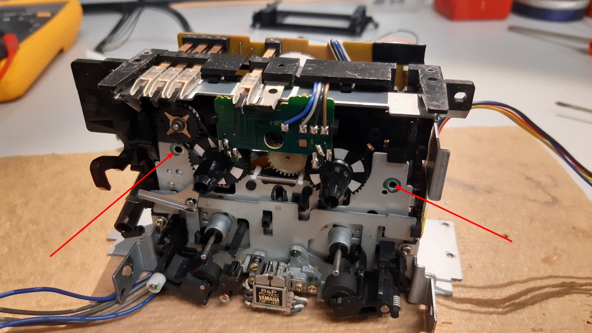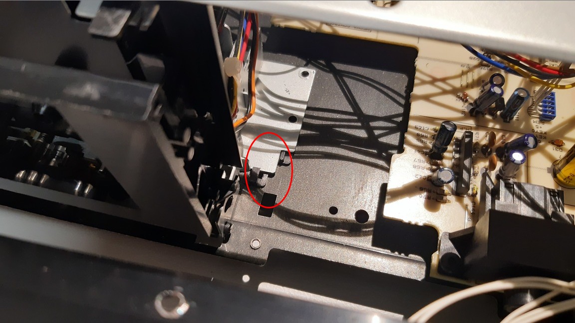 As a next step the metal plates on the side (1) and (2) have be removed. This is necessary to finally lift the capstan plate.