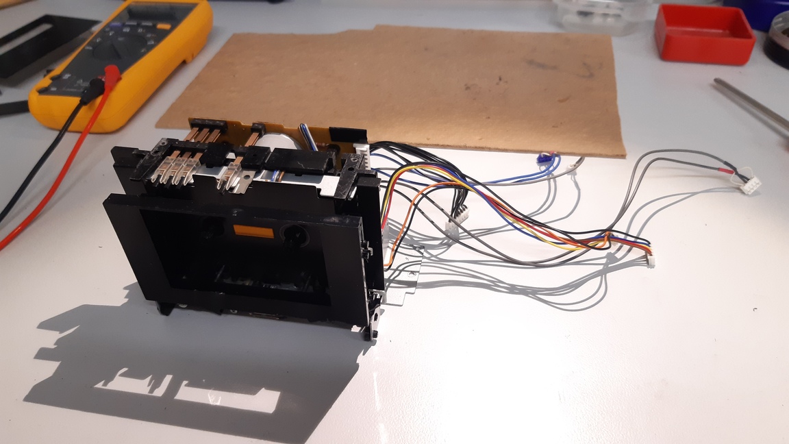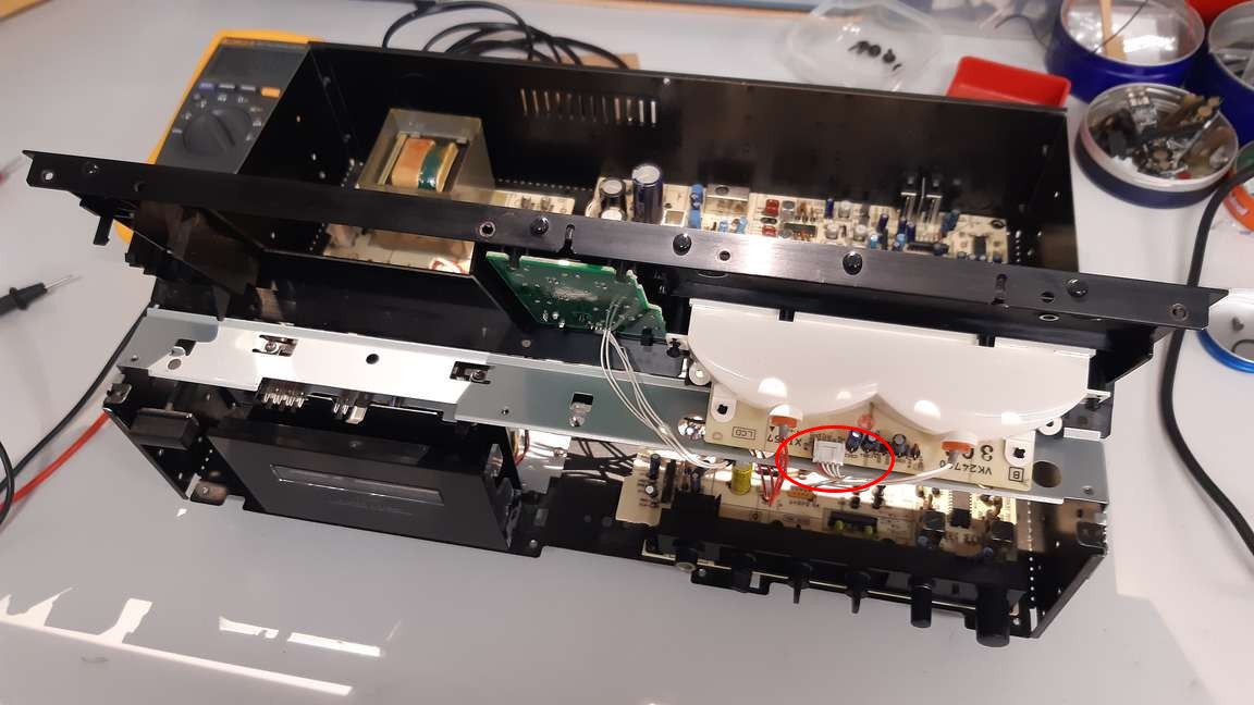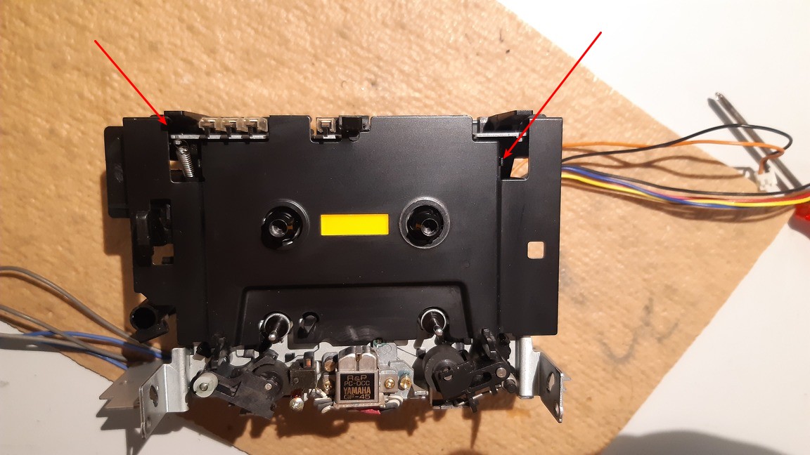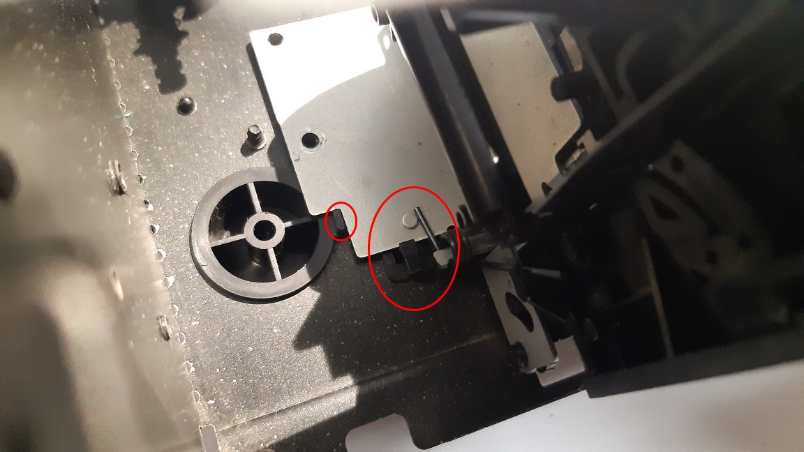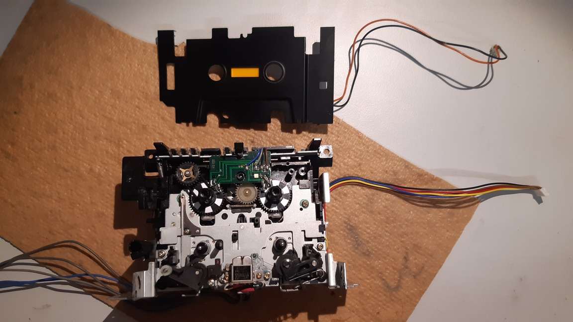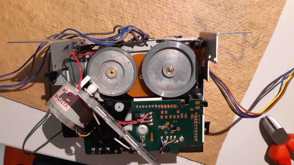 The previous owner already tried to replace the belt but failed. He told me it turn on but does not play. After a quick inspection it was quite obviously he had some issues in disassembling the tape mechanism. Some metal pieces where bent (ouch!), a motor connection was shorted and the PCB on the backside of the mechanism was cracked. As a result the deck did not detect whether a tape was inserted and one of the motors did not spin due to the short cut.