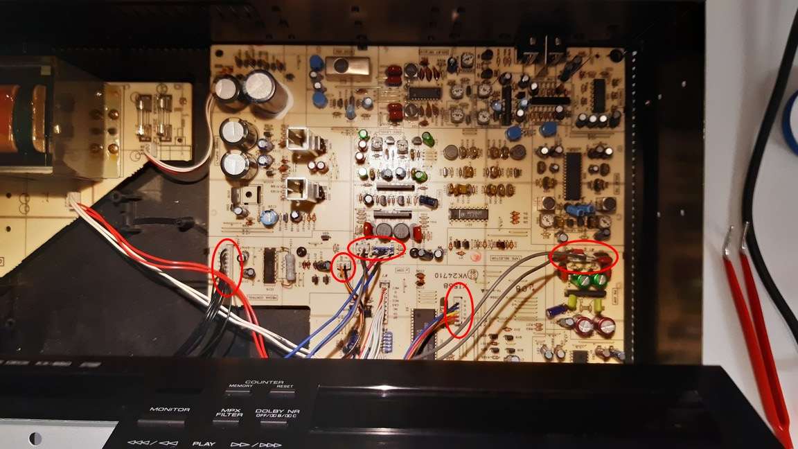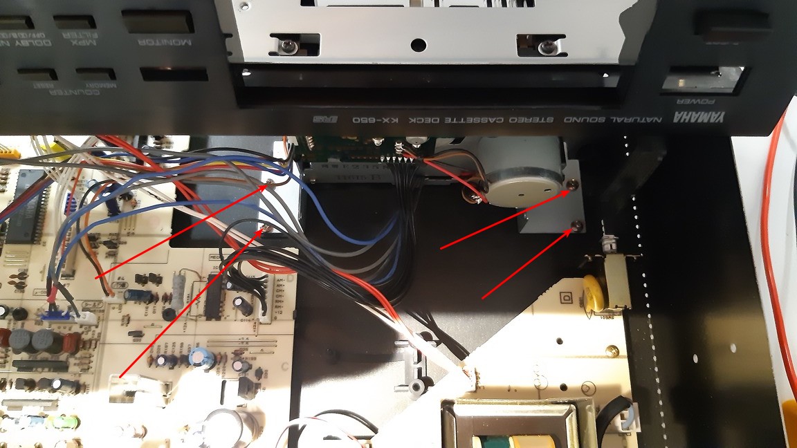 I had to completely disassemble the mechanism, soldered the broken trace on the PCB, fixed the motor connection and lubricated the capstan (very) carefully. Finally I replaced the belt, did some cleaning and adjusted the capstan speed. After reassembling the tape deck was just working as new. The Yamaha KX 650 is a great machine that can deal surprisingly well even with some old tapes I have back from the 80s. The play trim feature comes handy to 'fix' the higher frequencies if old tapes sound dull.