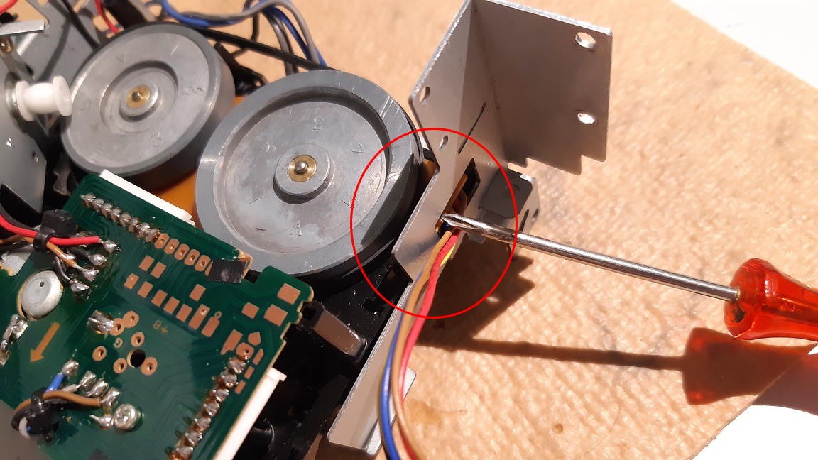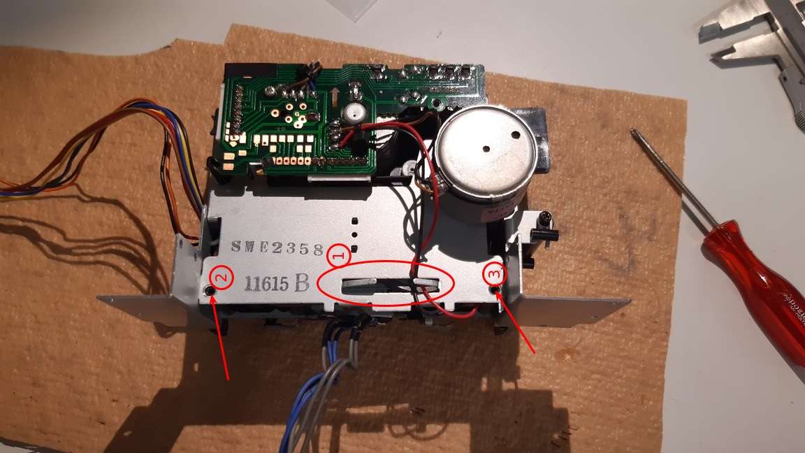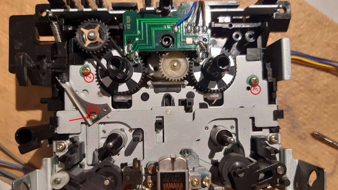 Free the cables by carefully bending the metal clamp (1). Then unscrew the screws that hold the capstan plate in place (2)+(3)