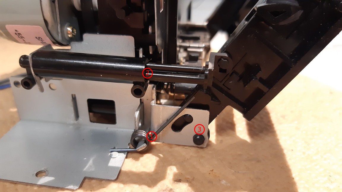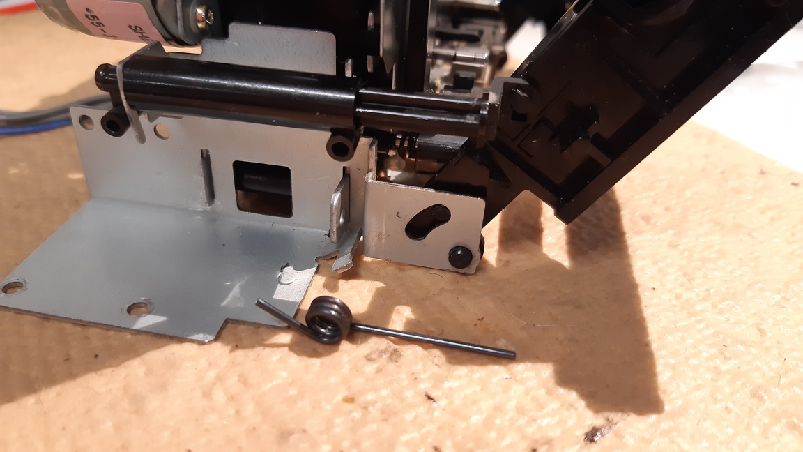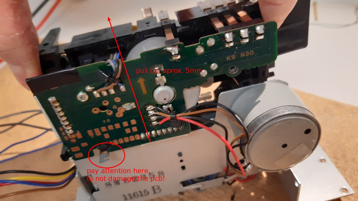 Pull the upper part of the mechanism to release the metal hook from the PCB. Take care to not damage the traces on the PCB. As you see my PCB is already slightly damaged in that area.